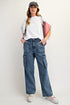 Get ready to elevate your casual look with our "Roxanne" wide-leg washed denim cargo pants. Featuring a back elastic waistband and flap pockets, these pants offer a loose and relaxed straight fit. Perfect for a laid-back outfit or dressed up with some kitten heels. Don't miss out!