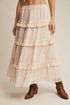 - Fabric Detail: Lightweight chiffon with delicate tonal embroidery - Tiered Design: Features layered panels with wide lace trim for added texture - Waistband: Comfortable elastic waist for a flexible, easy fit - Hemline: Gently flared silhouette for a graceful, boho flow - Lining: Fully lined for coverage and comfort - Style Versatility: Pairs effortlessly with cropped tops, knits, or boots for a western-inspired or romantic look - Model is 5' 9" 32-24-34 and wearing a size Small A dreamy mix of vintage charm and modern comfort, perfect for breezy styling year-round.