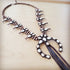 Make a fearless statement with the White Turqu Squash Blossom Necklace. Featuring vivid howlite turquoise stones, a bold tassel, and a commanding Naja pendant, this western-inspired design combines intricate silver detailing with unapologetic Southwestern spirit. Perfect for those who dare to stand out and infuse their look with raw, authentic style.